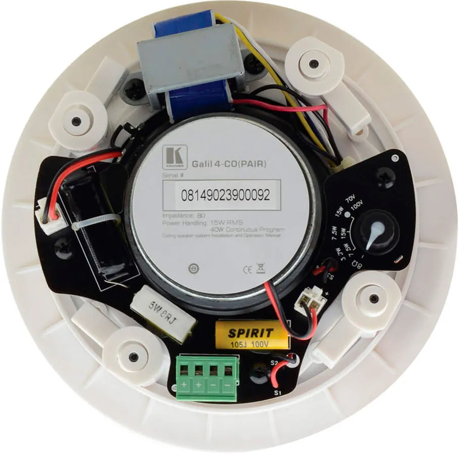 Kramer Galil 4-CO — пара высококачественных акустических систем открытого типа для встраивания в потолок. Громкоговорители имеют встроенный трансформатор с селектором мощности для низкоомного или высоковольтного 70 В / 100 В подключения.