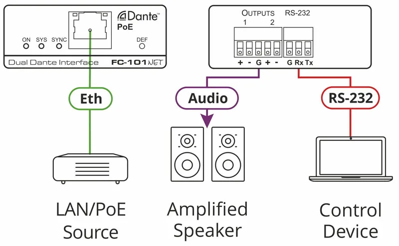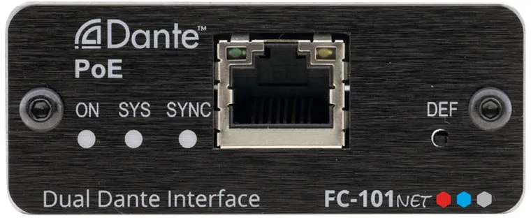 Kramer FC-101NET — компактный 2-канальный сетевой декодер интерфейса Dante™ с 2 балансными моно выходами. Прибор позволяет вывести 2 канала аналогового сигнала из сети Dante c удаленным управлением по сети Ethernet и интерфейсу RS-232. Питание прибора осуществляется по технологии POE любым совместимым оборудованием.