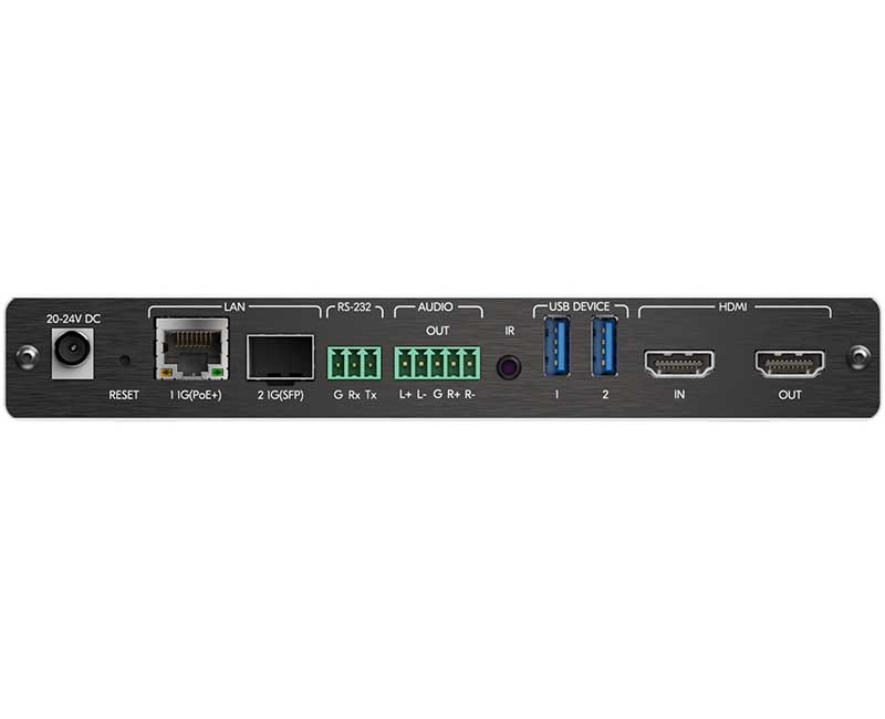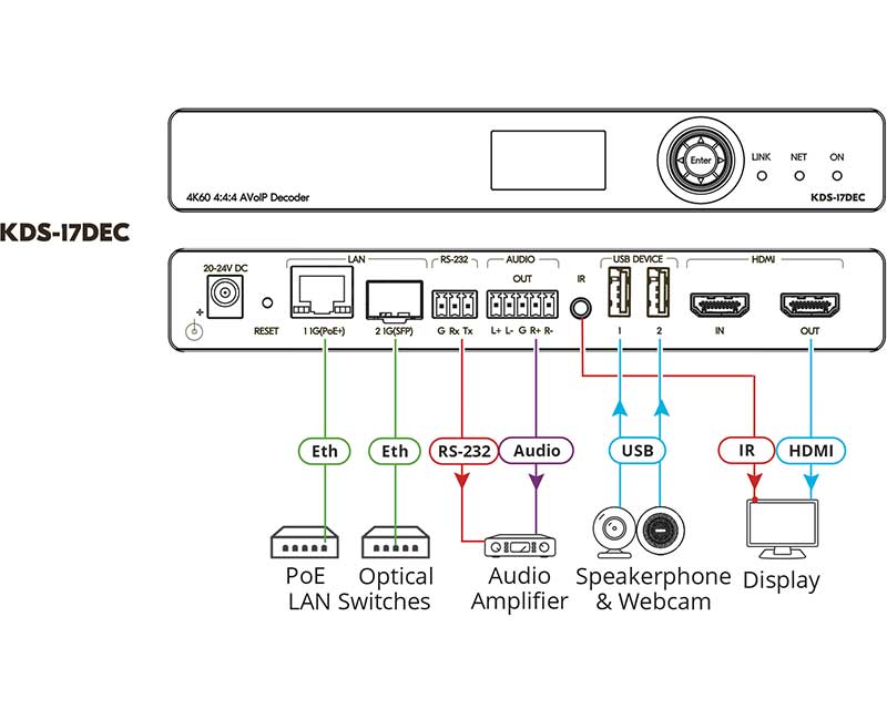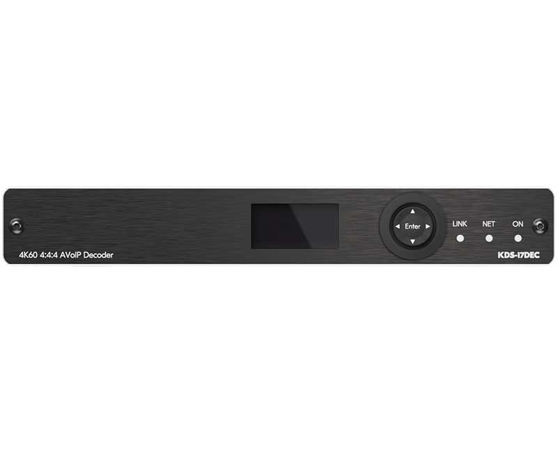 Kramer KDS-17DEC — декодер и приёмник из сети Ethernet сигналов HDMI разрешением до 4K@60 Гц (4:4:4), а также сигналов аудио, RS-232, ИК и USB. KDS-17DEC производит преобразование цифрового потока, передаваемого по сети IP на основе медной витой пары и/или оптоволоконного кабеля в режиме Unicast или Multicast, в исходный сигнал HDMI с деэмбедированием аудио, а также сигналы RS-232, ИК и USB.