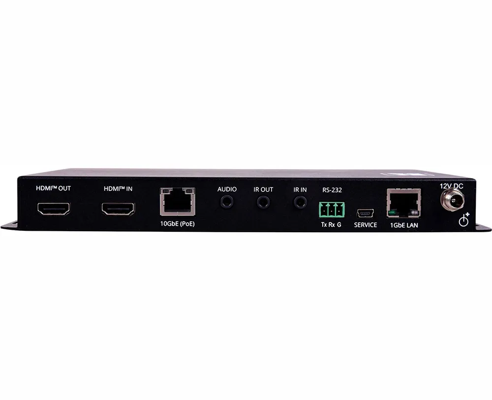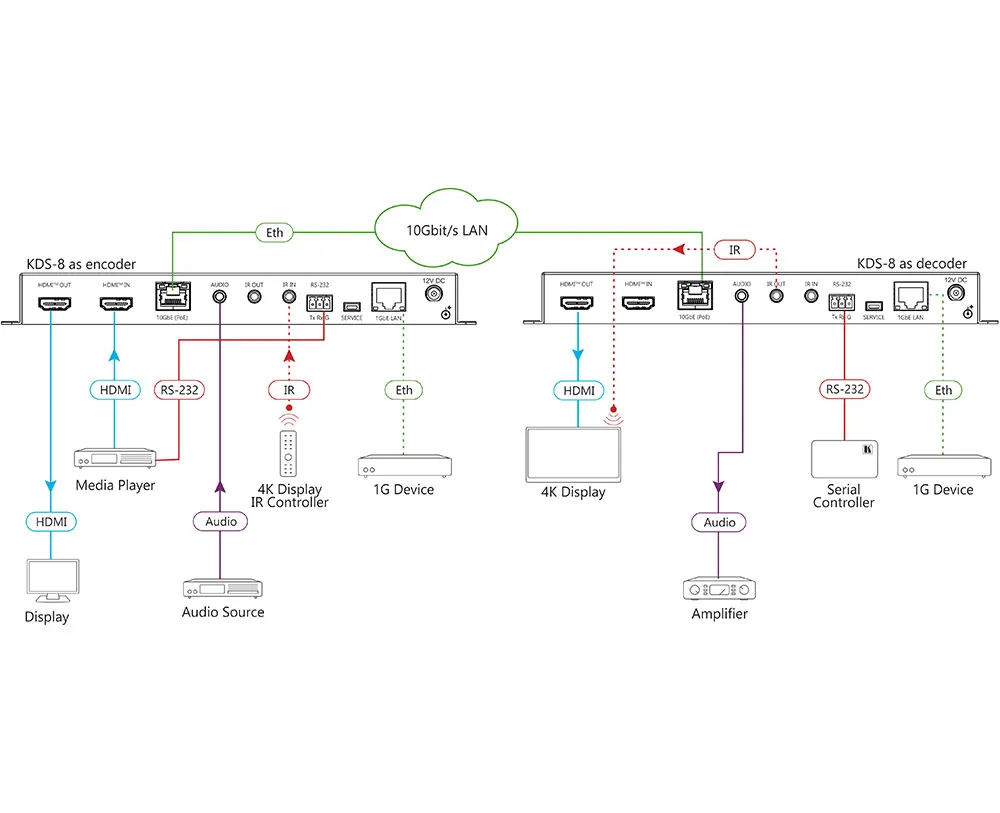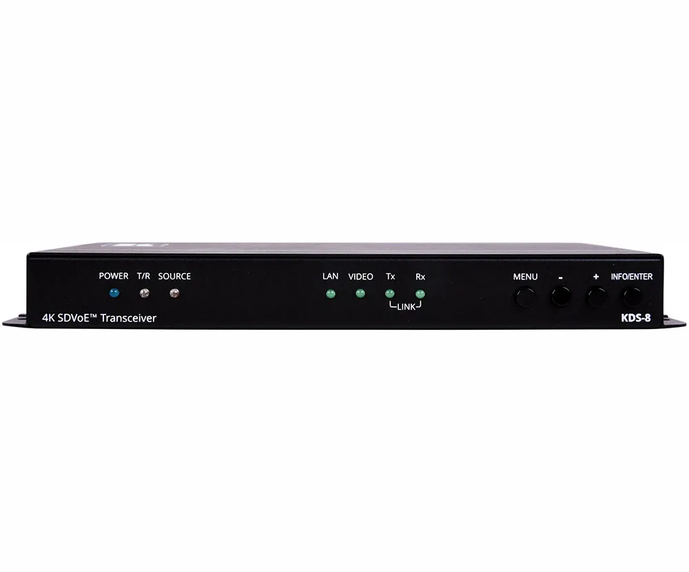 Kramer KDS-8 – кодер/декодер и передатчик/приемник потокового видео с разрешением до 4К@60 Гц (4:4:4) по сети Ethernet c задержкой, близкой к нулевой. В качестве кодера прибор производит преобразование сигнала HDMI, сигналов управления RS-232 и ИК, а также аналогового аудиосигнала в цифровой поток, передаваемый по сети IP. В качестве декодера прибор производит восстановление исходных сигналов из цифрового потока и передачу их на соответствующие выходы.