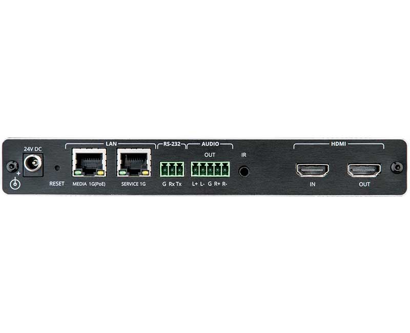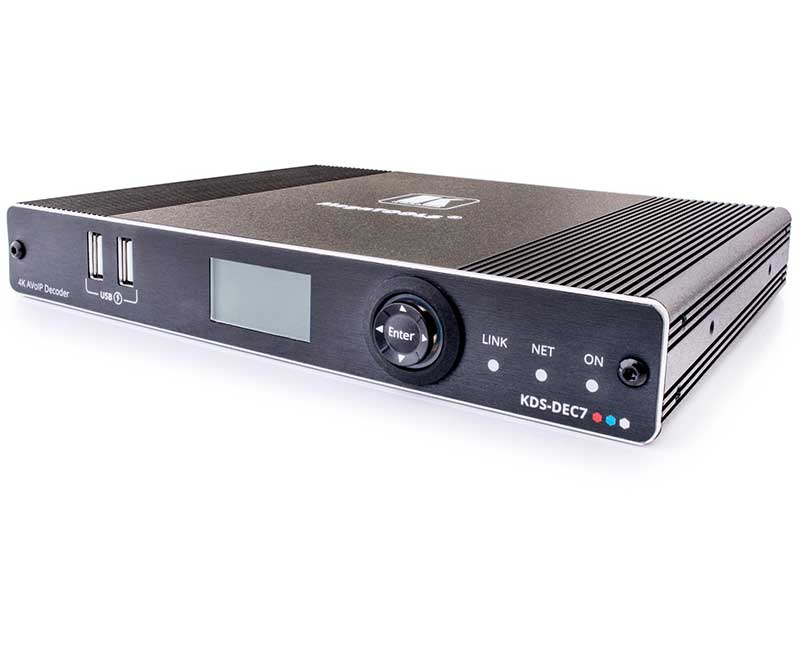 Kramer KDS-DEC7 — декодер из сети Ethernet сигналов HDMI с разрешением до 4K@60 Гц (4:2:0), аудио, RS-232, ИК и USB. KDS-DEC7 производит преобразование цифрового потока в режиме Unicast или Multicast, принимаемого из сети Ethernet, в сигналы HDMI, деэмбедированного аудио, RS-232, ИК и USB. Передатчиком потока может служить, например, прибор KDS-EN7, KDS-SW2-EN7 или WP-SW2-EN7.