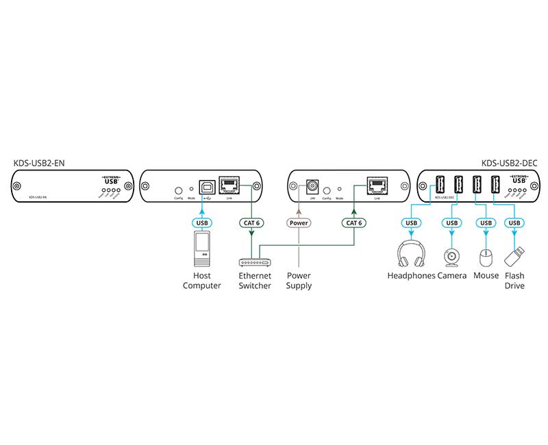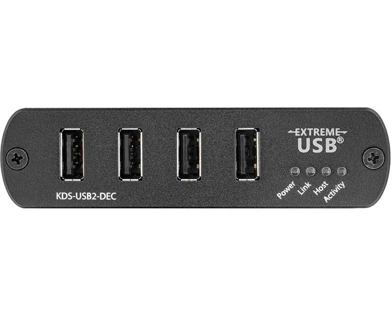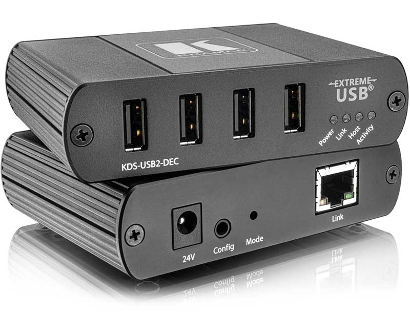 Kramer KDS-USB2-DEC — декодер, предназначенный для удаленного подключения периферийных USB-устройств, (таких как мышь, клавиатура, дисплей, видеокамера, устройство мобильной связи, медиаплеер, накопитель на жестком диске и т.д.), к хост-компьютеру по сети Ethernet при совместном использовании с кодером KDS-USB2-EN . Кодер KDS-USB2-EN подключается к хост-компьютеру, а декодер KDS-USB2-DEC — к удаленным USB-устройствам, обеспечивая связь между хост-компьютером и удаленными периферийными устройствами. 1 кодер KDS-USB2-EN и 1 декодер KDS-USB2-DEC обеспечивают удлинение USB-интерфейса для максимум четырех устройств, подключаемых к декодеру. Однако, имеется возможность расширения системы путем добавления до 6 дополнительных декодеров KDS-USB2-DEC способных работать с одним кодером KDS-USB2-EN. При помощи системы на основе KDS-USB2 можно, например, подключить несколько удаленных USB-камер, находящихся на разных объектах, к центральному компьютеру, или подключить к компьютеру по локальной сети несколько удаленных пользователей для совместной работы. Возможности системы можно значительно расширить при помощи облачной платформы управления Kramer Control, позволяющей удаленно управлять множеством устройств KDS-USB2.