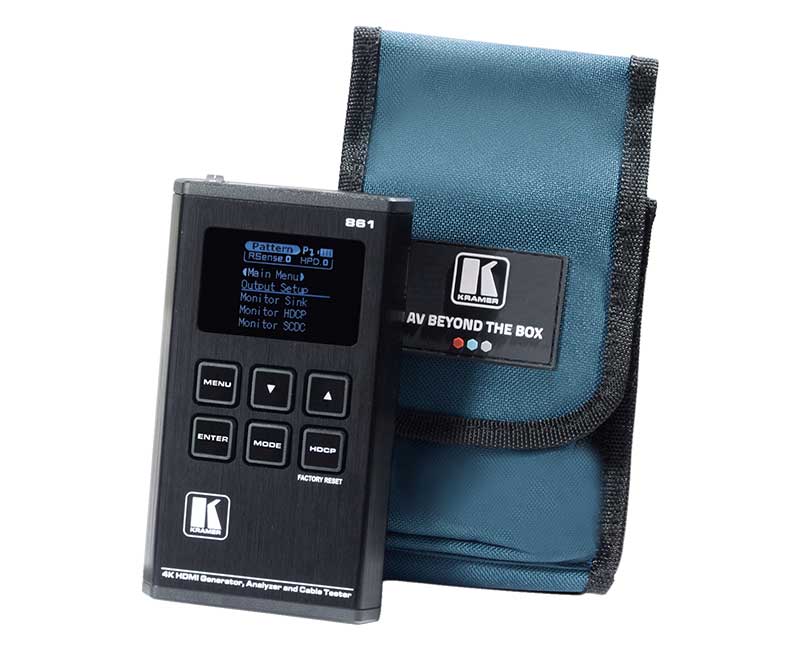Kramer 861 — компактный портативный прибор для генерации тестовых сигналов и анализа линий HDMI c разрешением до 4K@60 Гц (4:4:4) и поддержкой HDR10, HDMI 2.0, HDCP 2.2. Прибор обеспечивает скорость передачи данных до 18 Гбит/с (6 Гбит/с на графический канал), имеет 23 встроенных разрешения, 11 тестовых шаблонов и более десяти аналитических функций. Устройство позволяет анализировать пакеты данных HDMI, блоки данных EDID, HDCP, включая эмуляцию, загрузку пользовательских блоков и мониторинг канала SCDC (Status and Control Data Channel). Прибор генерирует тестовые тона различных частот и уровней по 8 аудиоканалам LPCM. Прибор оснащен встроенным литий-ионным аккумулятором, обеспечивающим до 5 часов автономной работы.