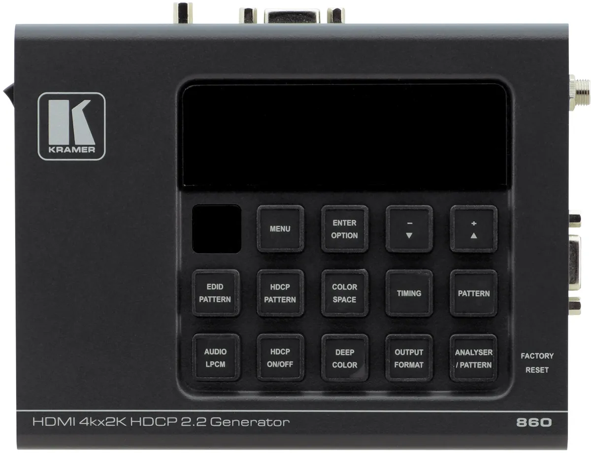 Генератор-анализатор сигналов Kramer 860 HDMI 18G (6G на графический канал) – это компактный и удобный прибор, формирующий тестовое изображение и проверяющий работоспособность тракта с сигналами разрешением до 4K/60 Гц (4:4:4), поддержкой HDMI 2.0/HDCP 2.2. По умолчанию поддерживается 88 стандартных разрешений, предусмотрено 55 тестовых изображений и более десяти вариантов анализа AV-сигналов, что выводит прибор в лидеры среди прочих аналогов. Поддерживается пакетная передача данных HDMI, анализ блоков данных EDID и HDCP, а также загрузка и эмуляция EDID.