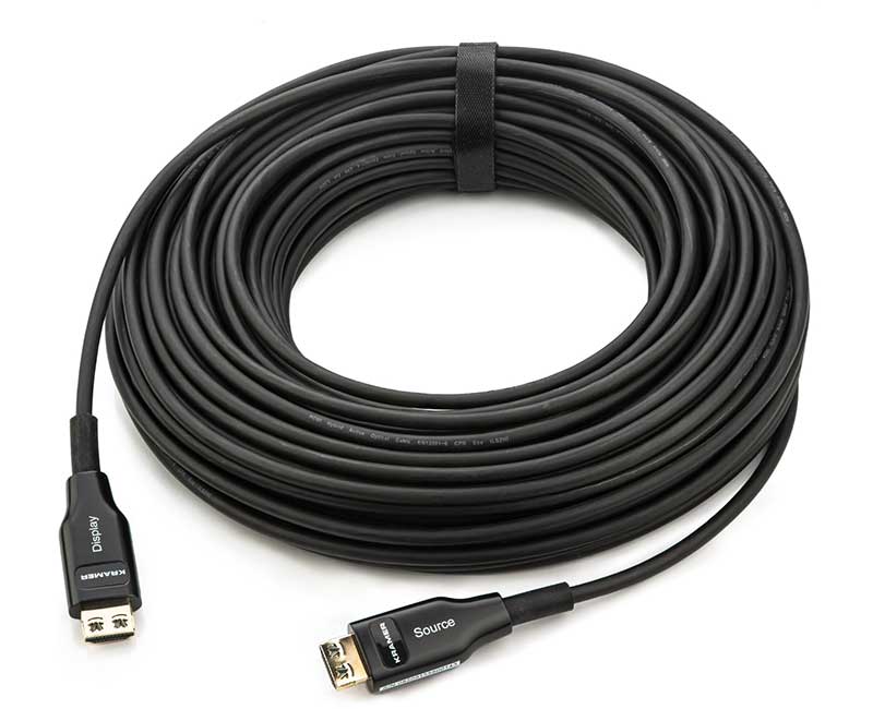 Kramer CLS-AOCH/UF — гибридный оптический кабель для передачи сигнала HDMI с разрешением до 8K@60 Гц на расстояние до 30 м. Кабель является активным устройством, при этом внешний источник питания не требуется. Поскольку кабель содержит помимо оптических волокон также и медные провода, он не обеспечивает гальванической развязки между источником и потребителем сигнала. Кабель CLS-AOCH/UF является высокотехнологичным изделием и обладает меньшей толщиной и большей гибкостью по сравнению с большинством медных и даже стандартных оптоволоконных кабелей, имеющихся на рынке. Кабель обеспечивает сквозную передачу данных EDID и поддержку HDCP, а также отсутствие потерь сигнала при повышенной защищенности от воздействия электромагнитного излучения и радиопомех.
