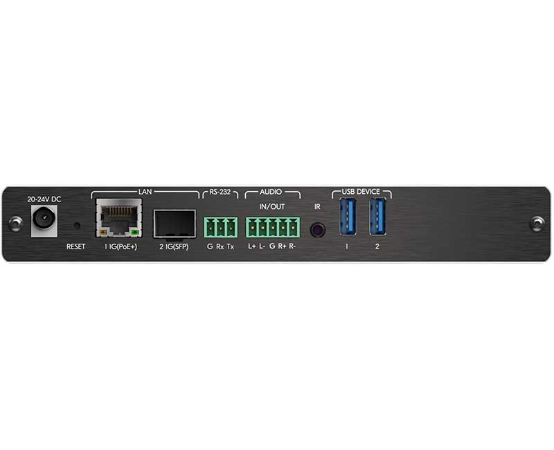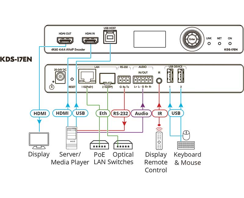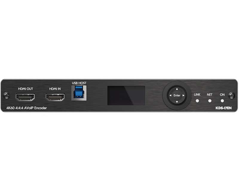 Kramer KDS-17EN — кодер и передатчик в сеть Ethernet сигналов HDMI разрешением до 4K@60 Гц (4:4:4), а также сигналов аудио, RS-232, ИК и USB. KDS-17EN производит преобразование видеосигнала, эмбедированного аудио, RS-232, ИК и USB в цифровой поток, передаваемый по сети IP на основе медной витой пары и/или оптоволоконного кабеля в режиме Unicast или Multicast. В качестве совместимого приёмника/декодера из цифрового потока может использоваться прибор KDS-17DEC.