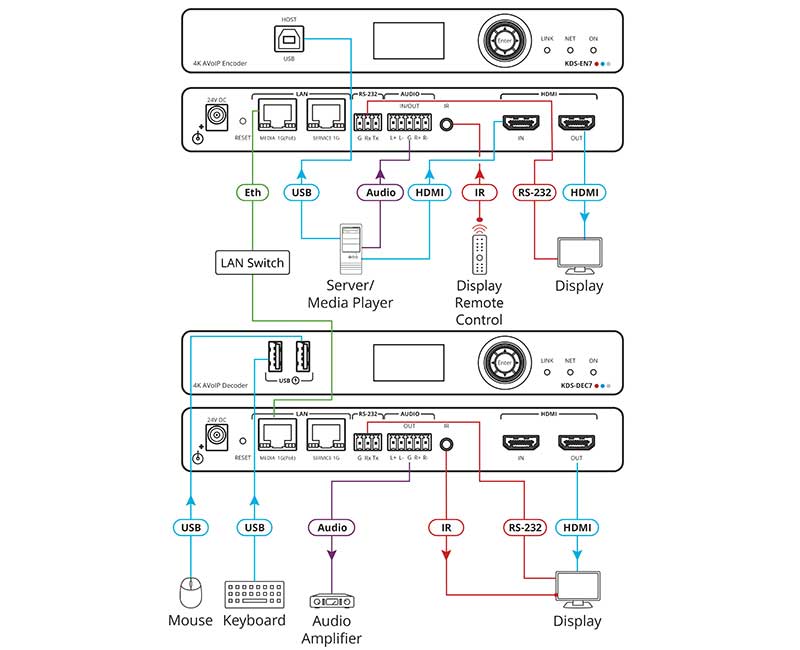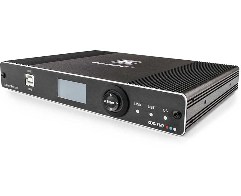 Kramer KDS-EN7 — кодер и передатчик в сеть Ethernet сигналов HDMI с разрешением до 4K@60 Гц (4:2:0), аудио, RS-232, ИК и USB. KDS-EN7 производит преобразование сигналов HDMI, эмбедированного аудио, RS-232, ИК и USB в цифровой поток, передаваемый по сети IP на основе медной витой пары в режиме Unicast или Multicast. Приёмником потока может служить, например, прибор KDS-DEC7.