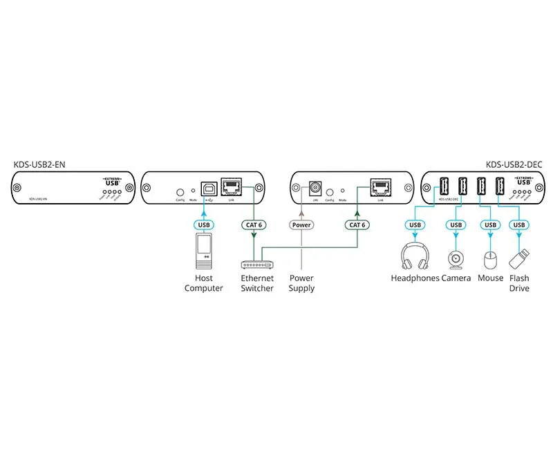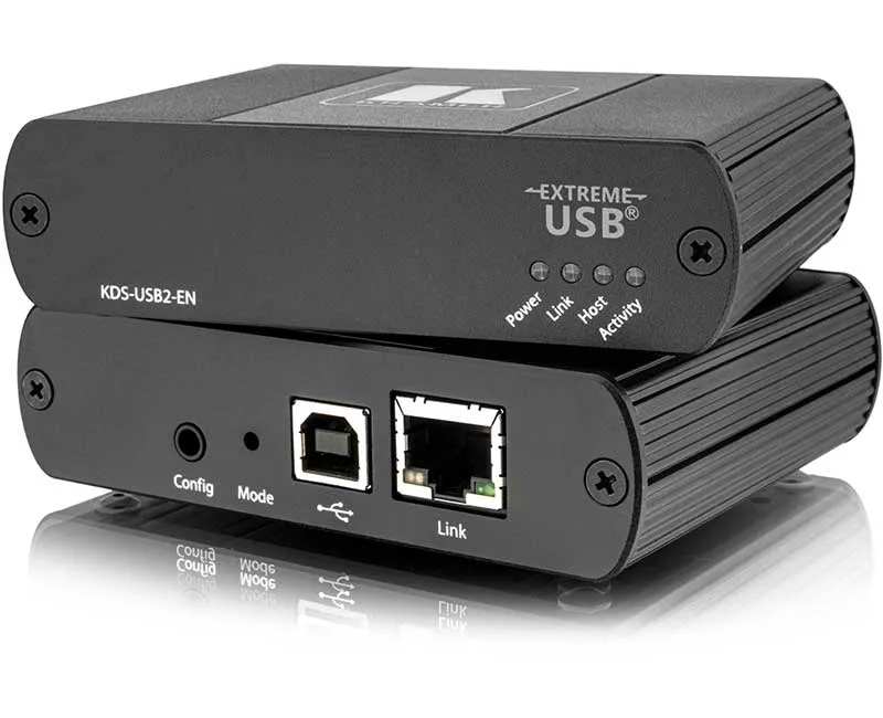 Kramer KDS-USB2-EN — кодер, предназначенный для удаленного подключения периферийных USB-устройств, (таких как мышь, клавиатура, дисплей, видеокамера, устройство мобильной связи, медиаплеер, накопитель на жестком диске и т.д.), к хост-компьютеру по сети Ethernet. Кодер KDS-USB2-EN может использоваться в паре с декодером KDS-USB2-DEC для образования в простейшем варианте канала точка-точка для удлинения интерфейса USB по Ethernet. Кодер KDS-USB2-EN подключается к хост-компьютеру, а декодер KDS-USB2-DEC — к удаленным USB-устройствам, обеспечивая связь между хост-компьютером и удаленными периферийными устройствами. 1 кодер KDS-USB2-EN и 1 декодер KDS-USB2-DEC обеспечивают удлинение USB-интерфейса для максимум четырех устройств, подключаемых к декодеру. Однако, имеется возможность расширения системы путем добавления до 6 дополнительных декодеров KDS-USB2-DEC, способных работать с одним кодером KDS-USB2-EN. При помощи системы на основе KDS-USB2-EN и KDS-USB2-DEC можно, например, подключить несколько удаленных USB-камер, находящихся на разных объектах, к центральному компьютеру, или подключить к компьютеру по локальной сети несколько удаленных пользователей для совместной работы. Возможности системы можно значительно расширить при помощи облачной платформы управления Kramer Control, позволяющей удаленно управлять множеством устройств KDS-USB2.