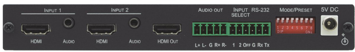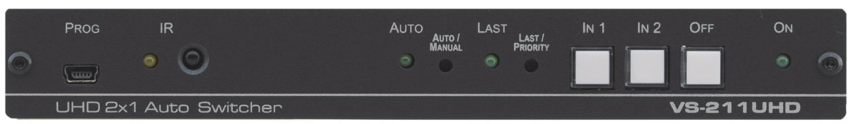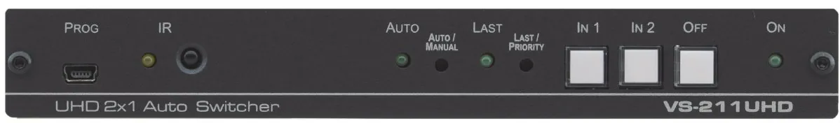 Kramer VS-211UHD —коммутатор сигналов HDMI и аналогового стерео сигнала с функцией автоматического переключения. Прибор поддерживает автоматическое переключение по приоритетному или последнему активному входу, ручное переключение кнопками на передней панели, удаленное управление замыканием «сухих» контактов, через интерфейс RS-232 и Kramer Step-In устройств.