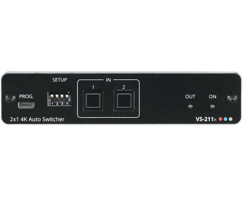 Kramer VS-211X – коммутатор 2х1 HDMI c автоматическим переключением входов по наличию сигнала с поддержкой разрешений до 4K@60 Гц (4:4:4) и технологии HDR. Выбор одного из двух режимов автоматического переключения: на вход с приоритетом, или на вход с последним по времени подключения активным источником сигнала.