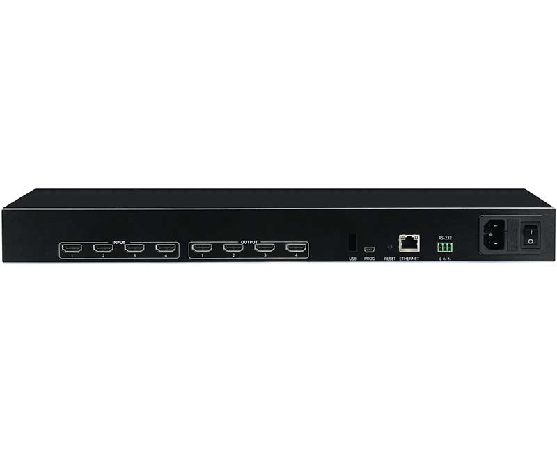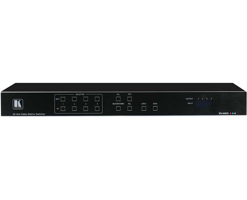 Kramer VS-44H2 — матричный коммутатор 4х4 сигналов HDMI c поддержкой разрешений до 4K@60 Гц (4:4:4) и технологии HDR. Прибор осуществляет перетактирование входного сигнала, компенсацию АЧХ кабеля и переключение сигнала HDMI от любого из четырёх источников сигнала, (в т.ч. поддерживающих HDCP-кодирование), на любой из четырех выходов, или на все выходы одновременно.