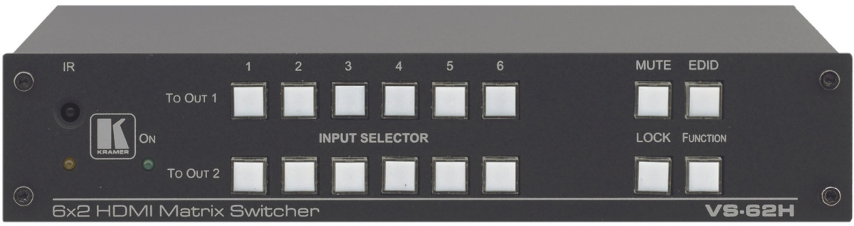 Kramer VS-62H - высококачественный матричный коммутатор сигналов HDMI. Он позволяет подключить любой из входов к любому выходу или к любому набору выходов. Прибор выполняет компенсацию АЧХ кабеля и перетактирование сигнала. Полоса пропускания прибора позволяет передавать сигналы с разрешением 4K. Дополнительно входы прибора поддерживают технологию Step-In (при использовании совместимых источников сигнала).