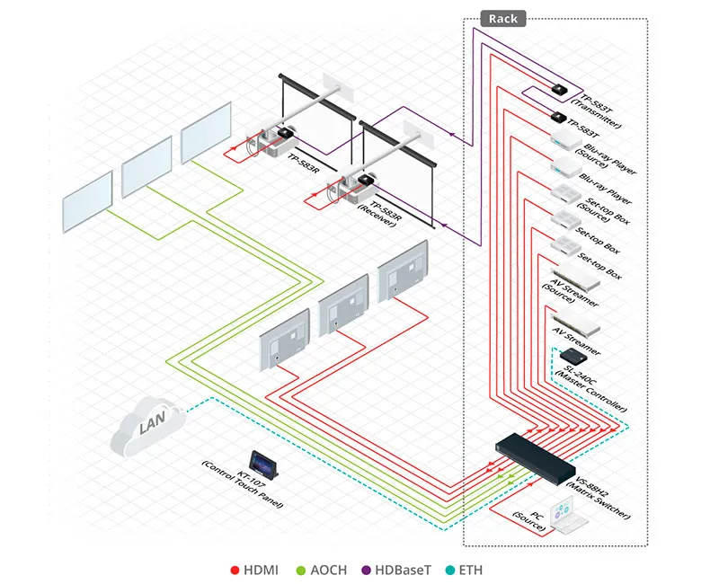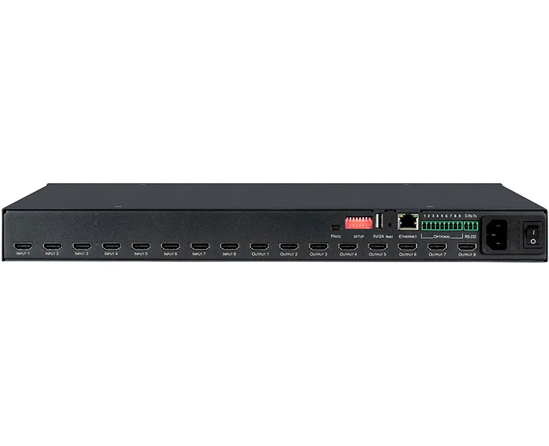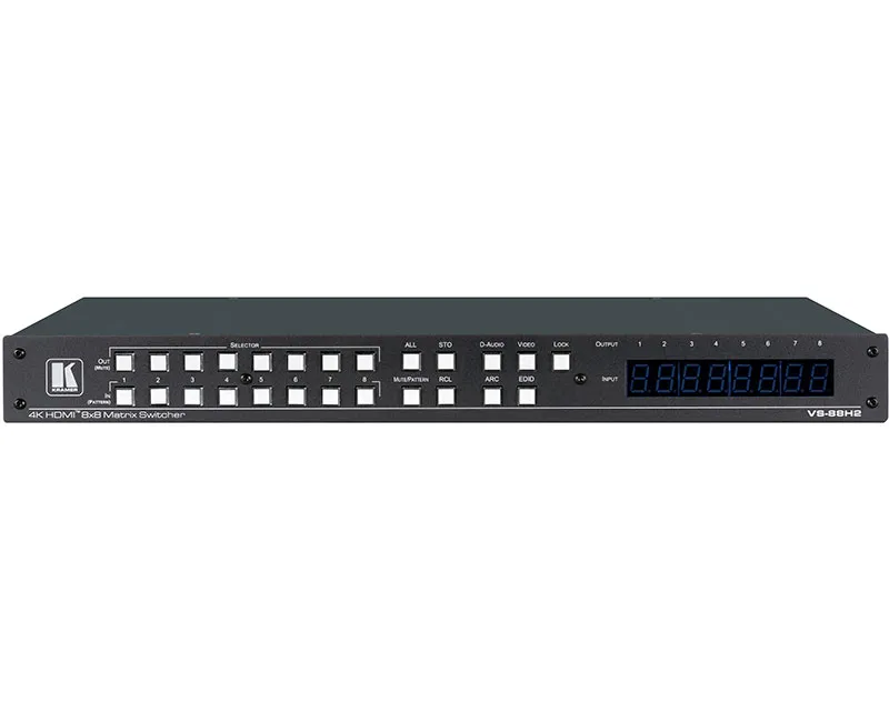 Kramer VS-88H2 – матричный коммутатор 8х8 сигналов HDMI c поддержкой разрешений до 4К@60 Гц (4:4:4) и технологии HDR, а также функцией независимого переключения цифровых аудиосигналов. Прибор осуществляет перетактирование входного сигнала, компенсацию АЧХ кабеля и переключение сигнала HDMI от любого из восьми источников сигнала, поддерживающих HDCP-кодирование, на любой из восьми выходов в любых комбинациях. VS-88H2 обладает непревзойденной гибкостью коммутации аудиосигналов, позволяя переключать любой эмбедированный цифровой аудиосигнал на любой цифровой выход в дополнение к восьми источникам обратного аудиоканала (ARC), что эквивалентно аудиоматрице размерностью 16x12.