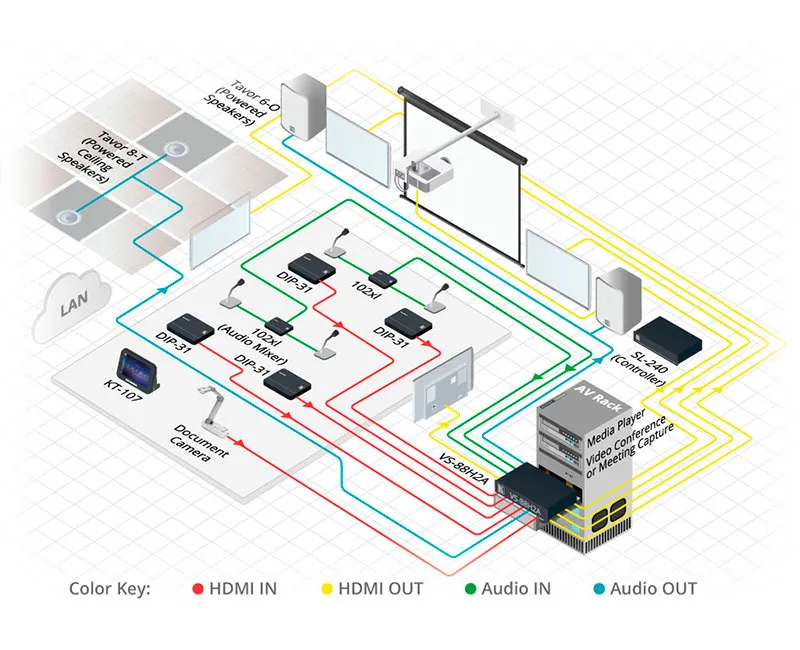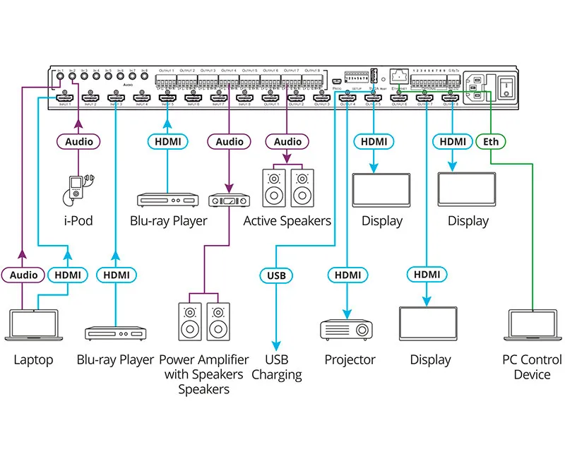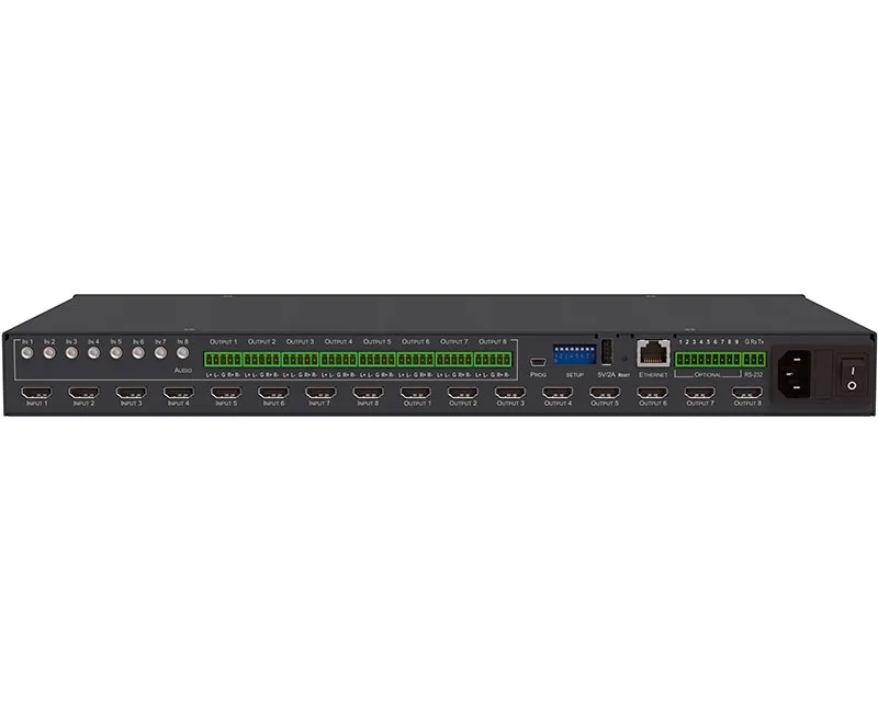 | Входы: | HDMI x8, небалансное стерео аудио x8 (гнездо mini-jack 3,5 мм) | |