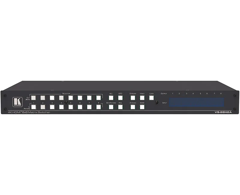 Kramer VS-88H2А – высококачественный матричный коммутатор 8х8 сигналов HDMI c поддержкой разрешений до 4K@60 Гц (4:4:4) и технологии HDR, а также функцией независимого переключения аналоговых и цифровых аудиосигналов. Прибор осуществляет перетактирование входного сигнала, компенсацию АЧХ кабеля и переключение сигнала HDMI от любого из восьми источников сигнала (в т.ч. поддерживающих HDCP-кодирование), на любой из восьми выходов, или любой набор выходов. VS-88H2А обладает непревзойденной гибкостью коммутации аудиосигналов, позволяя переключать любой эмбедированный цифровой или аналоговый аудиосигнал на любой цифровой или аналоговый выход в дополнение к восьми источникам обратного аудиоканала (ARC), что эквивалентно аудиоматрице размерностью 24x20.