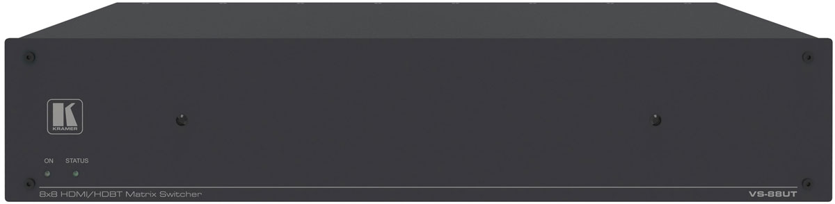 Kramer VS-88UT — презентационный матричный коммутатор сигналов HDMI, HDBaseT 2.0, аналогового и цифрового аудио со встроенным контроллером помещения и усилителем мощности. Прибор осуществляет коммутацию видео и аудиосигналов разрешением до 4K@60Hz (4:2:0), обеспечивает выделение и встраивание аналогового аудиосигнала в выходной сигнал HDMI и HDBaseT. VS-88UT обеспечивает двустороннюю передачу сигналов USB, ИК, RS-232 и данных Ethernet по единой линии HDBaseT с питанием совместимых приемников по технологии POE. Встроенный усилитель мощности позволяет воспроизводить выходной аудиосигнал непосредственно на громкоговорителях. Встроенный контроллер помещения обеспечивает удаленное управление мультимедийным оборудованием через сеть Ethernet, c помощью портов двунаправленного управления RS-485 (1) и RS-232 (4), 4 портов ИК, 4 портов ввода-вывода GPIO и 4 реле типа «сухой» контакт. Контроллер поддерживает сеть K-NET™ для подключения проводных панелей управления.