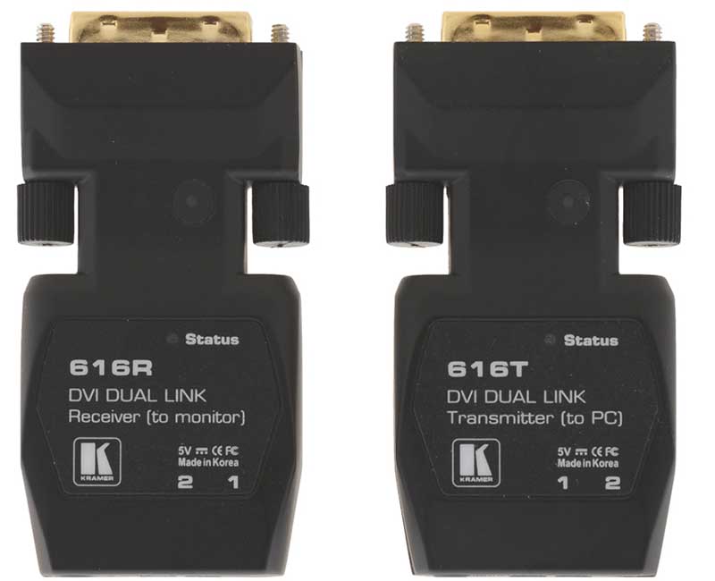 Kramer 616T/616R — комплект из передатчика и приёмника сигнала dual−link DVI разрешением до 3840 x 2400@33 Гц по кабелю на основе многомодового оптического волокна, терминированному 2 разъёмами типа LC (c каждой из сторон). Передатчик 616T преобразует поступающий на его вход видеосигнал dual−link DVI в световой сигнал, который передаётся по волоконно-оптическому кабелю на вход приёмника 616R, осуществляющего обратное преобразование светового потока в исходный сигнал dual−link DVI. Дальность передачи сигнала составляет до 500 м для разрешения 3840 x 2400@33 Гц.