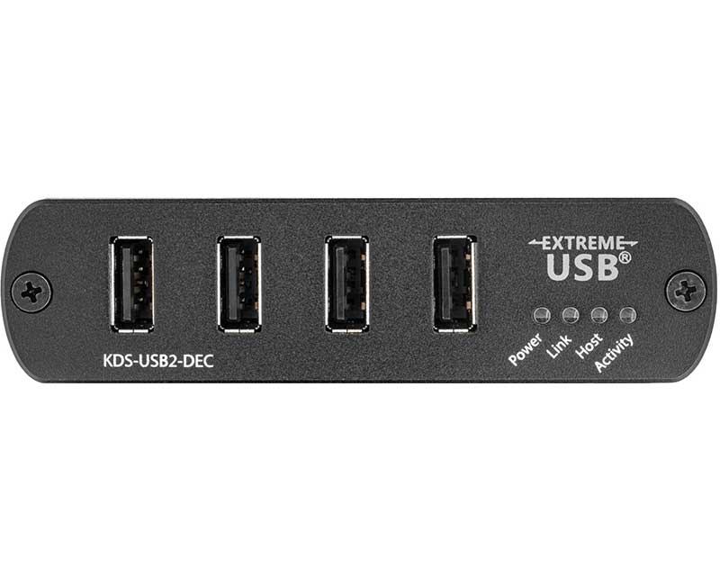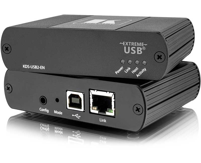 Kramer KDS-USB2 — комплект, состоящий из кодера и декодера, предназначенный для удаленного подключения периферийных USB-устройств, (таких как мышь, клавиатура, дисплей, видеокамера, устройство мобильной связи, медиаплеер, накопитель на жестком диске и т.д.), к хост-компьютеру по сети Ethernet. Кодер KDS-USB2 подключается к хост-компьютеру, а декодер KDS-USB2 — к удаленным USB-устройствам, обеспечивая связь между хост-компьютером и удаленными периферийными устройствами. 1 кодер KDS-USB2-EN и 1 декодер KDS-USB2-DEC, входящие в комплект KDS-USB2, обеспечивают удлинение USB-интерфейса для максимум четырех устройств, подключаемых к декодеру. Однако, имеется возможность расширения системы путем добавления до 6 дополнительных декодеров KDS-USB2-DEC, (приобретаемых отдельно), способных работать с одним кодером KDS-USB2-EN. При помощи системы на основе KDS-USB2 можно, например, подключить несколько удаленных USB-камер, находящихся на разных объектах, к центральному компьютеру, или подключить к компьютеру по локальной сети несколько удаленных пользователей для совместной работы. Возможности системы можно значительно расширить при помощи облачной платформы управления Kramer Control, позволяющей удаленно управлять множеством устройств KDS-USB2.