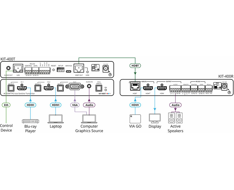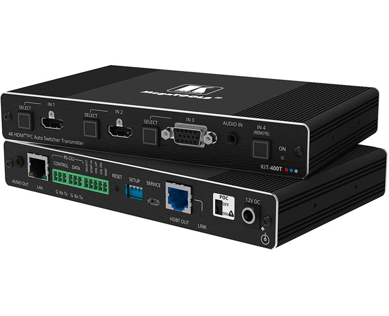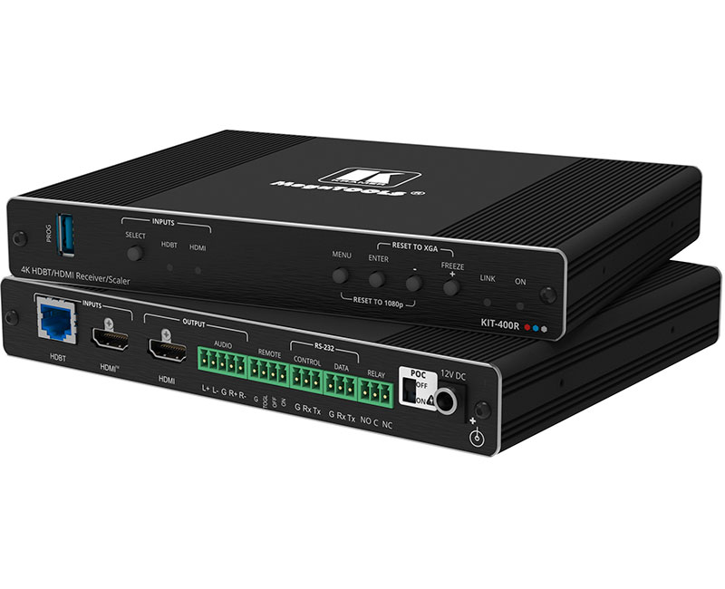 Kramer KIT-400 — комплект, включающий автоматический коммутатор/передатчик KIT-400T и приемник/масштабатор KIT−400R сигналов 4K HDMI и VGA по витой паре HDBaseT. Передатчик KIT-400T преобразует сигнал с выбранного пользователем входа в сигнал HDBaseT. Приемник KIT-400R принимает сигнал HDBaseT, преобразует его в сигнал HDMI и производит его повышающее или понижающее масштабирование c целью приведения разрешения сигнала к собственному разрешению подключенного к приемнику дисплея HDMI. Комплект KIT-400 обеспечивает передачу сигнала по кабелю медной витой пары на расстояние до 40 м для разрешения 4K@60 Гц (4:2:0), 24 бита на пиксель, и на большее расстояние для более низких разрешений.