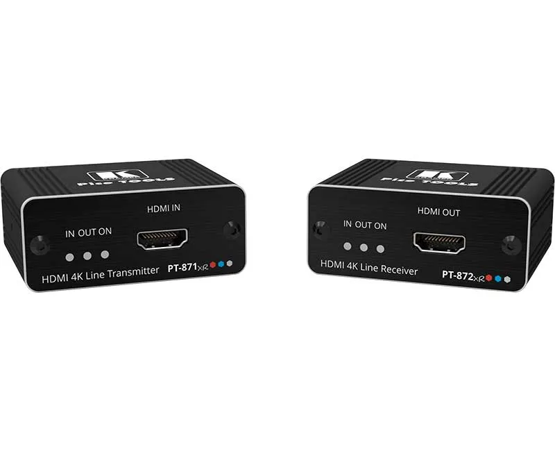 Kramer PT-871/2xr-KIT — комплект передатчика и приемника сигнала HDMI по кабелю на витой паре DGKatTM 2.0 c разрешением до 4K@60 Гц (4:4:4). Приборы поддерживают стандарты HDMI 2.0 и HDCP 2.2. Двустороннее питание; источник питания можно подключать только к одному из устройств, второе получает питание по кабелю витой пары. PT-871 конвертирует входной сигнал HDMI в формат DGKatTM 2.0 для передачи на дальние расстояния, PT-872xr осуществляет обратное преобразование. Комплект обеспечивает передачу сигналов на расстояние до 60 м с разрешением до 4K@60 Гц (4:4:4) или до 70 м с разрешением 4К@60 Гц (4:2:0) 8 бит на канал (при использовании экранированных кабелей типа витая пара Kramer).