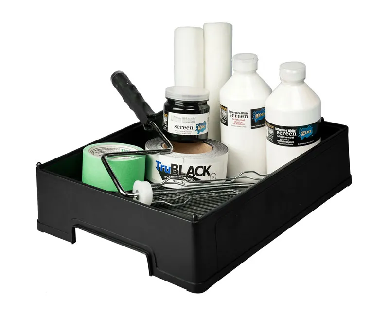Goo Kit High Contrast - комплект из покрытий серии High Contrast для подготовки проекционной поверхности и набора инструментов для нанесения покрытий. Включает в себя емкости с базовым отражающим и внешним покрытиями объемом 1 л, 250 мл черного покрытия для создания экранной рамки, валик с двумя роликами, маскировочную ленту и лоток объемом 4 л. Объема покрытий достаточно для формирования проекционной поверхности площадью около 4,5 м². Покрытие High Contrast подходит для умеренно освещенных помещений, используется с проекторами светосилой более 25 люмен на 1000 см².