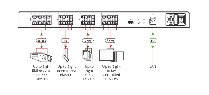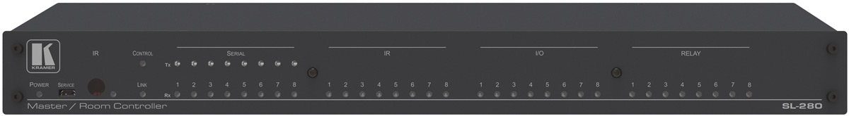 Kramer SL-280 — центральный контроллер помещения для управления комплексом аудио и видео оборудования через. Контроллер включает 8 двунаправленных интерфейсов RS-232, 8 ИК выходов, 8 GPIO портов, 8 реле типа «сухой» контакт. Прибор обеспечивает надежное управление коммутаторами, масштабаторами, дисплеями, аудио процессорами, проигрывателями, проекционными экранами, шторами и освещением и т.п.. Сетевые преобразователи интерфейсов Kramer обеспечивают расширение портов управления через сеть Ethernet.