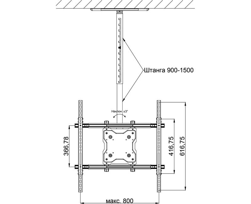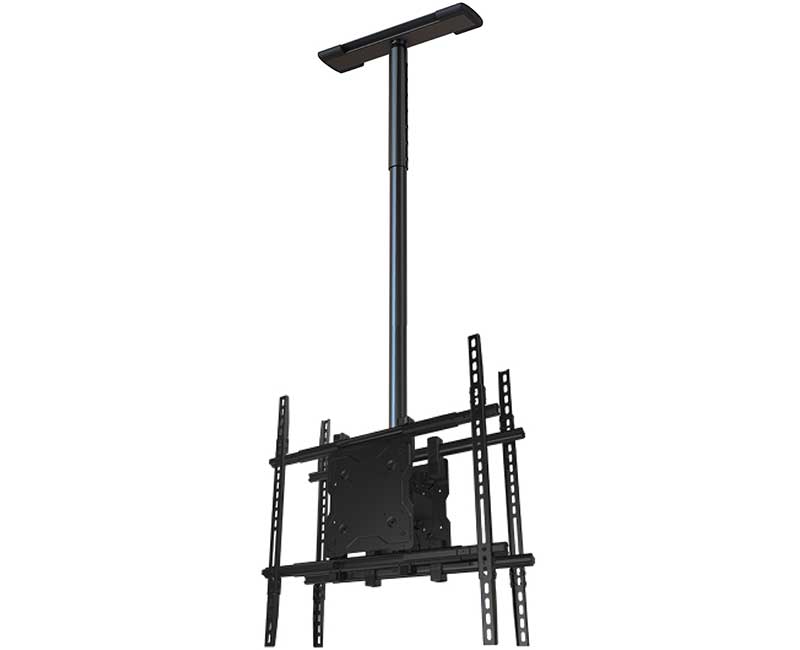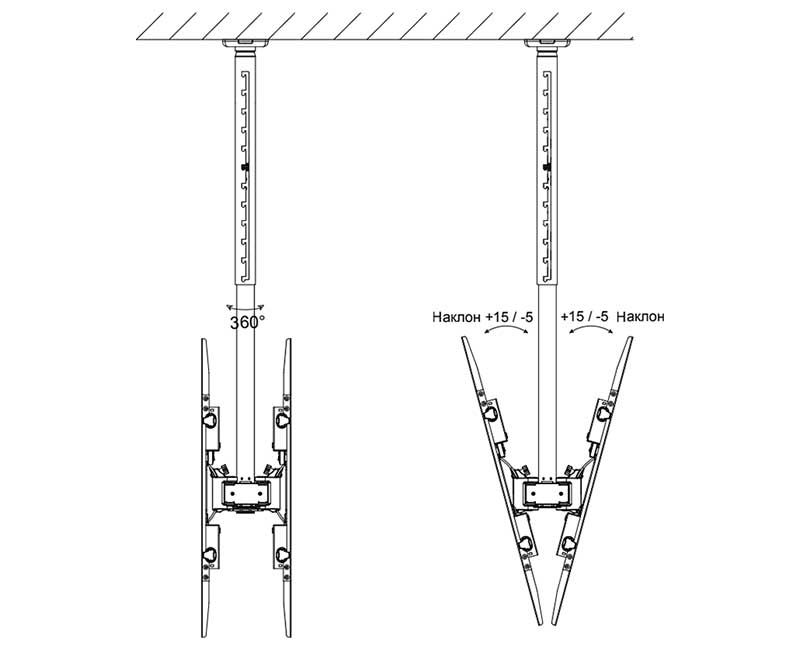 Потолочное крепление Wize Pro C55D36A для двух ЖК-дисплеев с диагональю 37"-80"+ поставляется с полным комплектом для инсталляции больших панелей: адаптером для экранов VESA, регулируемой по длине штангой (диапазон 91-152 см) и потолочным креплением для штанги. Предусмотрен наклон на 20º вперед и поворот на 360º. Длина крепления может увеличиваться за счет изменения высоты штанги, благодаря чему достигается оптимальное расположение дисплея.