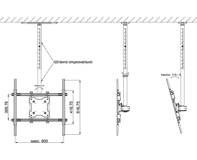 Потолочное крепление Wize Pro C75UNV для ЖК-дисплеев с диагональю 37 - 80+" идеально подходят для монтажа крупных панелей к потолку. Предусмотрен наклон на 20º вперед и поворот на 360º. Крепление Wize поставляется с адаптером VESA и потолочным креплением. Штанга в комплект не входит – ее необходимо приобрести отдельно.