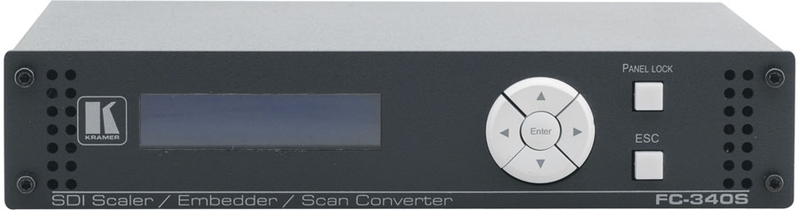 Kramer FC-340S - видеомасштабатор вещательного качества, устройство ввода/ извлечения аудиосигнала и преобразователь частоты развертки для цифровых сигналов вплоть до 3G HD?SDI. Прибор принимает сигналы SDI и AES/3id и одновременно выдает сигнал SDI (2 выхода) и композитный видеосигнал. Аудиосигнал, содержащийся во входном сигнале SDI, выдается одновременно на выходы AES/3id и балансного аудиосигнала.
