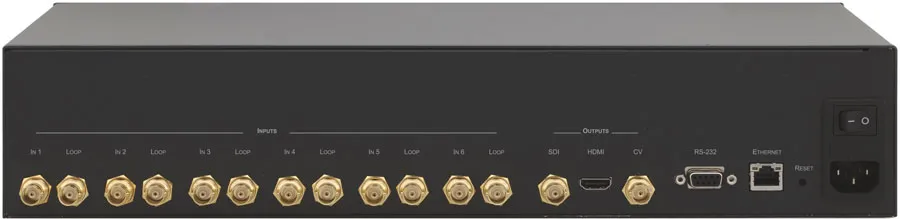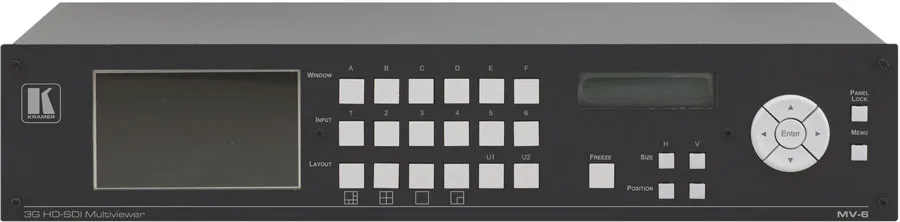 Kramer MV-6 — универсальное высококачественное устройство для отображения до шести сигналов HD-SDI 3G на одном дисплее в произвольном сочетании. Комбинированное изображение выдается на выход в форматах HD-SDI, HDMI и композитного видеосигнала одновременно. Возможно как заранее заданное, так и настраиваемое пользователем расположение элементов изображения на экране.