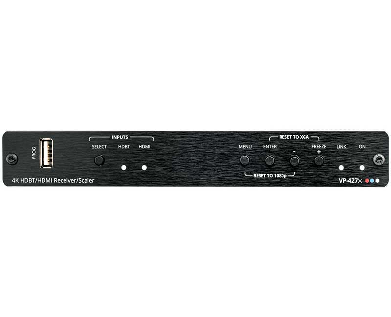 Kramer VP-427X представляет собой приемник HDBaseT со встроенным масштабатором в HDMI, локальным входом HDMI и функцией автоматического переключения входов. Прибор принимает сигнал HDBaseT от совместимого передатчика, преобразует его в сигнал HDMI и производит его повышающее или понижающее масштабирование до разрешения в пределах 4K@60 Гц (4:4:4). c целью приведения разрешения сигнала к собственному разрешению подключенного к выходу дисплея со входом HDMI. VP-427X обеспечивает прием сигнала по кабелю медной витой пары на расстояние до 40 м для разрешения 4K@60 Гц (4:2:0), 24 бита на пиксель, и на большее расстояние для более низких разрешений.