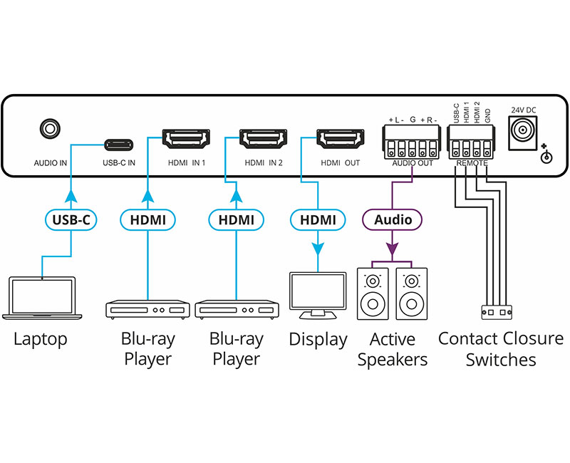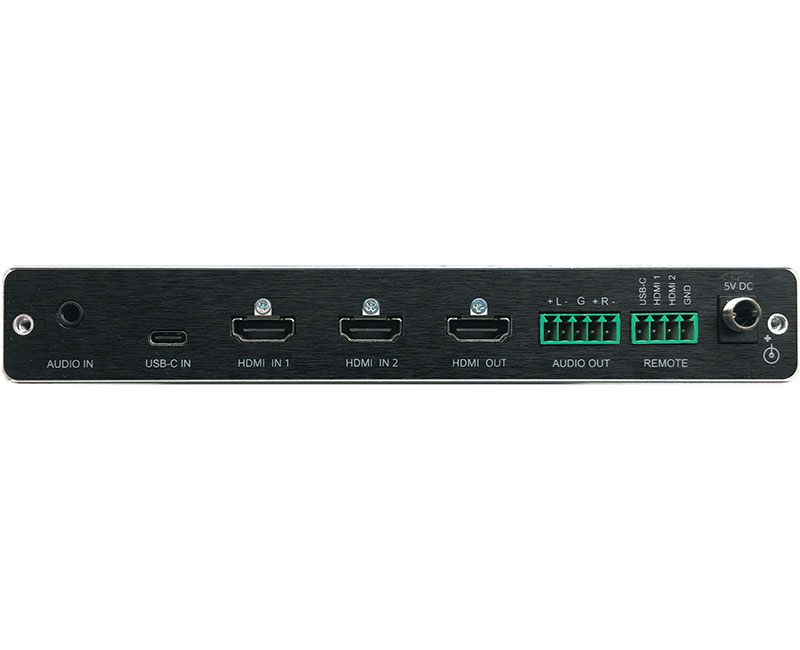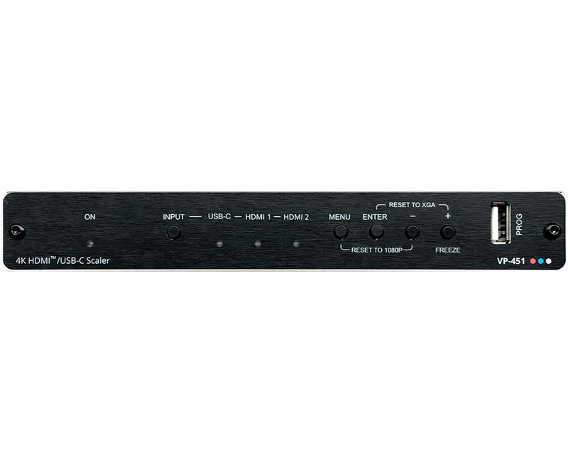 Kramer VP-451 – масштабатор-коммутатор сигналов HDMI (2) и USB-C с поддержкой разрешения 4K и скорости передачи данных до 18 Гбит/с. Прибор производит повышающее и понижающее масштабирование сигналов до 4K@60 Гц (4:4:4). Можно установить автоматический режим соответствия разрешения сигнала на выходе собственному разрешению дисплея или установить необходимое пользовательское разрешение вручную.
