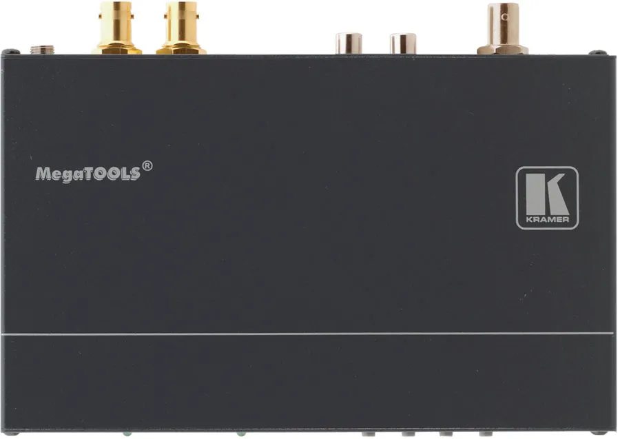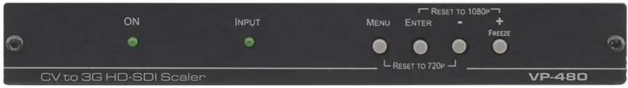 Kramer VP-480 — высококачественный цифровой масштабатор для композитного видеосигнала с небалансным стереофоническим аудиосигналом. Аудиосигнал вводится в видеопоток, который масштабируется в сигналы SDI, HD-SDI или 3G HD-SDI (2 одинаковых выхода).