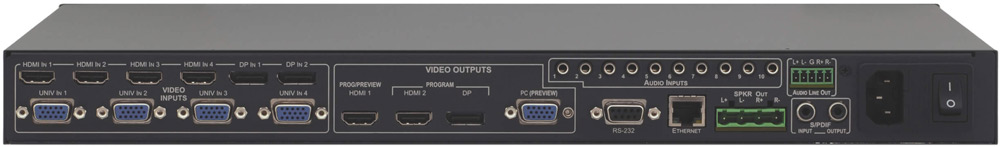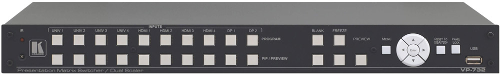Kramer VP-732 — 10-входовой презентационный коммутатор с двумя масштабаторами для сигналов с разрешением до 4K (Ultra HD). Прибор имеет 4 входа HDMI, 2 входа DisplayPort, 4 универсальных входа для аналоговых видеосигналов и 10 входов для аналоговых аудиосигналов. Прибор выполняет понижающее и повышающее масштабирование и выдает преобразованный сигнал на программный выход (с разрешением до 4K) и выход предварительного просмотра. Коммутация источников выполняется с использованием технологии FTB™ (Fade-Thru-Black, переход через гашение). Прибор поддерживает работу с аналоговыми и цифровыми аудиосигналами, обеспечивает обработку и вывод сигнала непосредственного на громкоговорители через встроенный усилитель мощности.