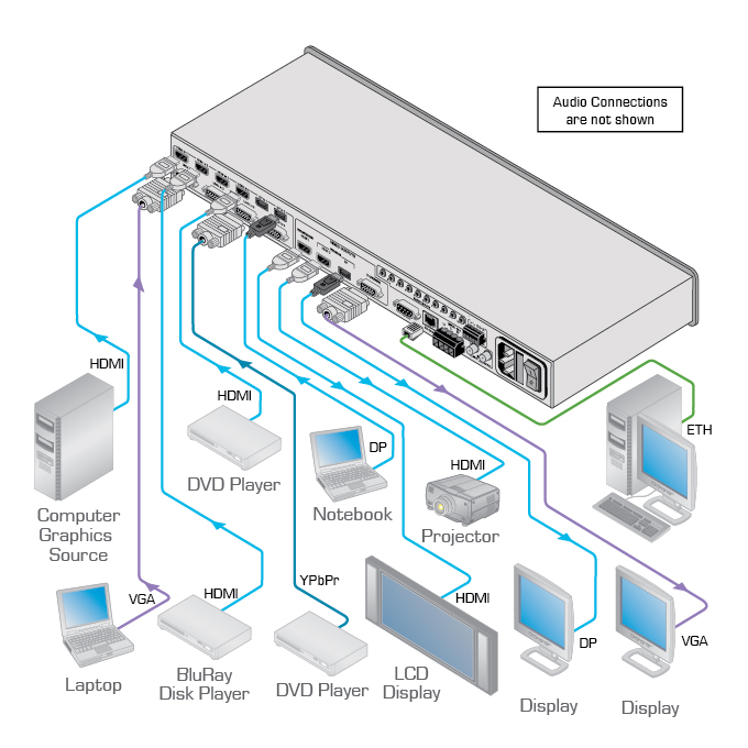 | Входы: | HDMI (4 вх.); DisplayPort (2 вх.); VGA, YPbPr, S-Video или CV (4 вх.): разъем DB-15; S/PDIF (1 вх.): разъем RCA; стерео аудио (10 вх.): разъем 3,5 мм | |