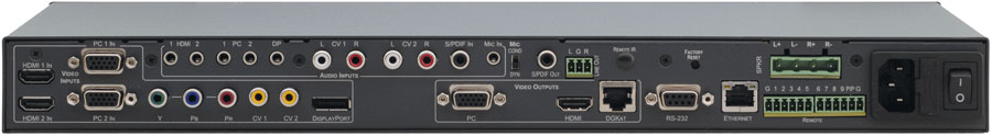 Kramer VP-770 - высококачественный цифровой презентационный масштабатор и коммутатор композитного и компонентного видеосигнала, сигнала DisplayPort, компьютерного графического сигнала, HDMI. Прибор масштабирует видеосигнал, вводит аудиосигнал и выдает результат на выход HDMI, выход компьютерного графического сигнала, выход DGKat на витую пару одновременно с цифровым аудиосигналом и небалансным стереофоническим аудиосигналом. Кроме того, усиленный звук выдается на балансный выход для подключения стереофонических громкоговорителей 10 Вт.