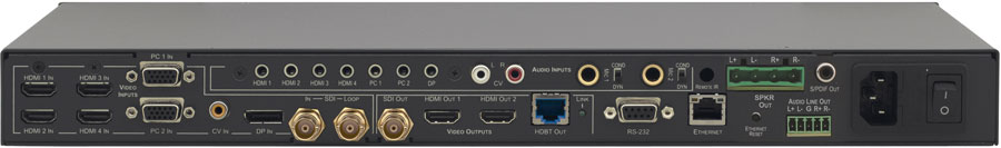 | Входы: | HDMI (4 вх.); VGA/YUV (2 вх.); разъемы HD-15; HD-SDI 3G (1 вх.): с проходным выходом, разъемы BNC; CV (1 вх.): разъем RCA; DisplayPort (1 вх.); Стереозвук (7 вх.): 3,5-мм мини-разъемы для входов HDMI, VGA, DP; Стереозвук (1 вх.): разъемы RCA для входа CV; Микрофонные (2 вх.): 6,25-мм разъем с выбором типа микрофона и фантомного питания 48 В | |