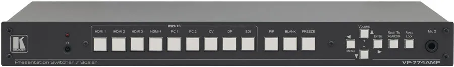 Kramer VP-774AMP - высококачественный презентационный коммутатор и масштабатор. Прибор принимает сигнал с одного из девяти входов: DisplayPort (DP), композитного видео, компьютерного графического сигнала (2 входа), 3G HD-SDI, HDMI (4 входа). Выполняется масштабирование видеосигнала, внедрение аудиосигнала, результирующий сигнал выдается на два выхода HDMI, один выход на витой паре HDBaseT и один 3G HD-SDI (вместе с S/PDIF и балансным стереофоническим аудиосигналом). В приборе также имеется усилитель мощности аудиосигнала и выходы на громкоговорители.