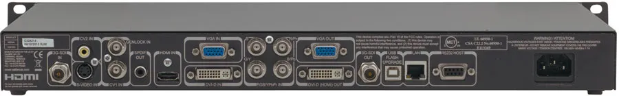 Kramer VP-794 - высококачественный масштабатор для аналоговых и цифровых видеосигналов, разработанный специально для отображения информации на больших дисплеях и на нескольких экранах. Прибор повышает или понижает разрешение входного сигнала, обрабатывает изображение по технологии HQV, вносит гибко управляемые предыскажения, выполняет коррекцию геометрии, на профессиональном уровне совмещает края изображений. Выходной сигнал поступает на разъемы 3G HD-SDI, DVI/HDMI, VGA и S/PDIF. В масштабаторе VP-794 имеется специальный режим для вывода изображений на светодиодные видеостены с изменением размеров изображения с точностью до пиксела.