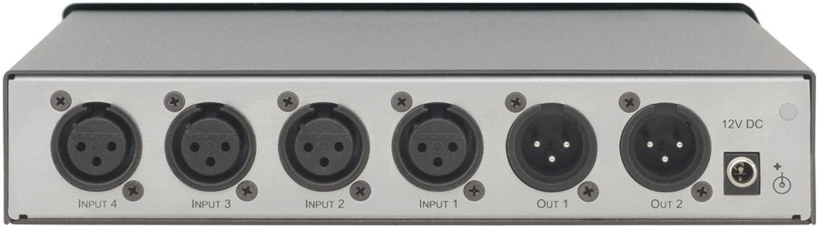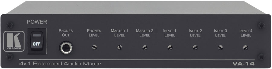 Kramer VA-14 — четырехканальный микшер для балансных монофонических аудиосигналов с разъемами XLR. Для каждого канала можно индивидуально выбрать режим работы с сигналами микрофонного или линейного уровня. Микшированный сигнал выдается на два балансных выхода и на выход для подключения головных телефонов.
