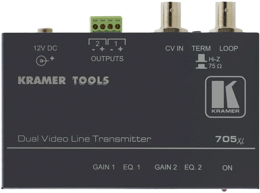 Kramer 705xl - передатчик, преобразующий композитный сигнал видео в сигнал для передачи по витой паре. Передатчик имеет один проходной вход видео, сигнал с которого поступает на два независимых выхода (клеммные модульные разъемы). Каждый выход имеет регуляторы уровня сигнала и контроля АЧХ (для одновременной подачи по двум разным линиям или по двум кабелям витой пары разного качества). Регуляторы уровня сигнала и контроля АЧХ позволяют оптимизировать качество сигнала при передаче на удаленные расстояния. При использовании кабелей высокого качества можно передавать полный диапазон цветных сигналов видео на расстояние до 1000 м. Вещательное качество сигнала (12 МГц) обеспечивается на расстоянии до 300 м. На меньших расстояниях поддерживается полоса пропускания сигнала до 30 МГц.