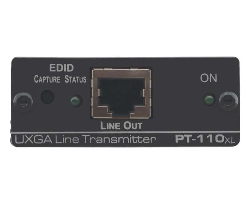 Kramer Kramer PT-110XL — линейный передатчик, получающий входной UXGA/WUXGA или HDTV сигнал и передающий его по кабелю на витой паре к соответствующему приемнику. Kramer Kramer PT-110XL размещен в мниатюрном корпусе Kramer Pico TOOLS и питается постоянным напряжением 12 В.