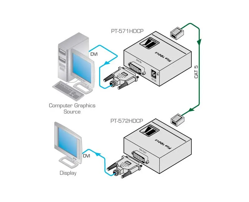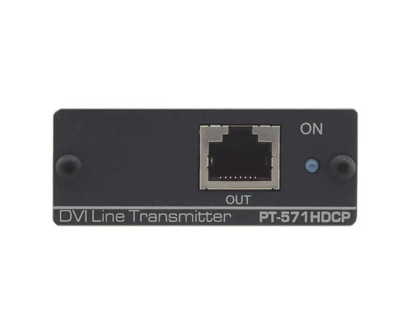 Kramer PT-571HDCP — передатчик сигнала DVI-D по кабелю на витой паре DGKat. Он преобразует сигнал DVI в формат, пригодный для такой передачи. Обратное преобразование выполняет приемник PT-572HDCP+.