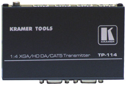 Kramer TP-114 — высококачественный усилитель-распределитель 1:4 для компьютерного графического сигнала или HDTV с выдачей сигналов в линии витой пары.