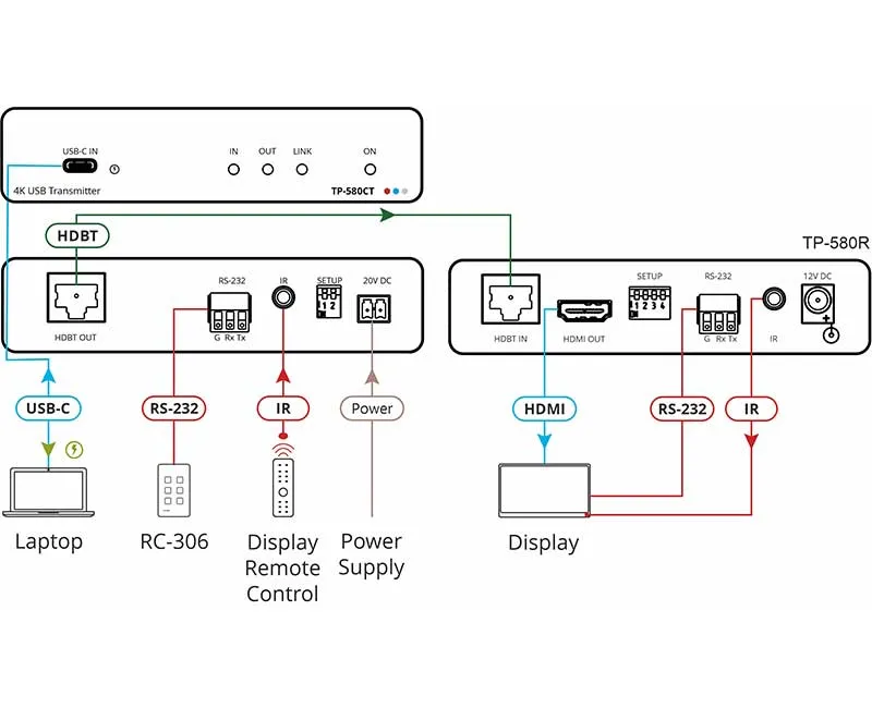 Kramer TP-580CT — передатчик видеосигналов с разрешением до 4K@60 Гц (4:2:0) от источников с портом USB-C, поддерживающим режим DP Alt Mode, а также сигналов RS-232 и ИК по кабелю медной витой пары HDBaseT 1.0. Максимальное расстояние передачи составляет 40 м для разрешений до 4K@60 Гц (4:2:0), 24 бита на пиксель, и более — для более низких разрешений.