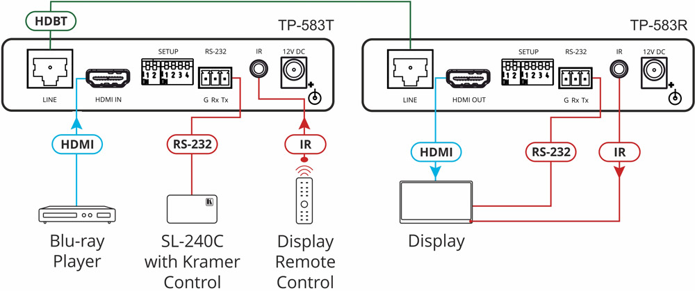 Kramer TP-583T – передатчик сигналов HDMI, RS-232 и ИК по кабелю витой пары HDBaseT c поддержкой разрешений до 4K@60 Гц (4:4:4) и технологии HDR. TP-583T обеспечивает передачу видеосигнала с разрешением 4K@30 Гц (4:4:4) на расстояние до 70 м при использовании рекомендованного медного кабеля витой пары производства Kramer Electronics. При использовании кабелей других производителей максимальные значения расстояния передачи могут снижаться.