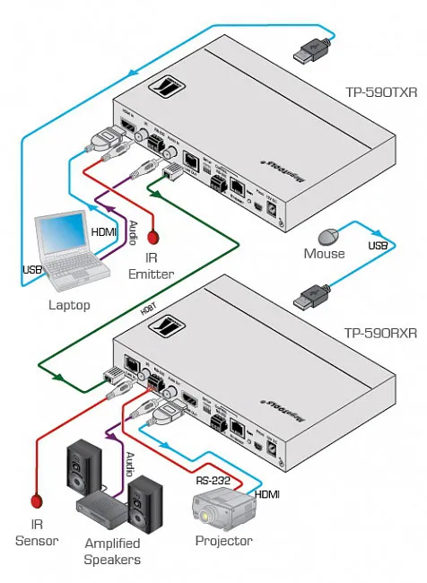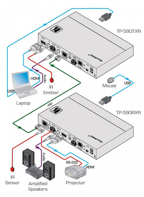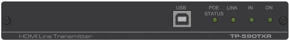 Kramer TP-590TXR — высококачественный передатчик сигналов HDMI, USB 2.0, двунаправленного RS-232, ИК, Ethernet и небалансного стереофонического аудиосигнала по кабелю на витой паре по технологии HDBaseT 2.0. Прибор преобразует входные сигналы в формат, пригодный для передачи по витой паре, приемник TP-590TXR выполняет обратное преобразование.
