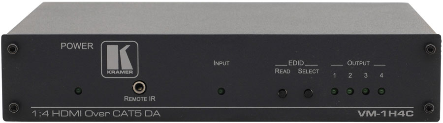 Kramer VM-1H4C - высококачественный усилитель-распределитель для передачи сигналов HDMI, RS-232 и сигналов инфракрасного управления по кабелю на витой паре. Он выполняет перетактирование сигнала и компенсацию АЧХ кабеля, после чего выдает сигнал на четыре одинаковых выхода DGKat.