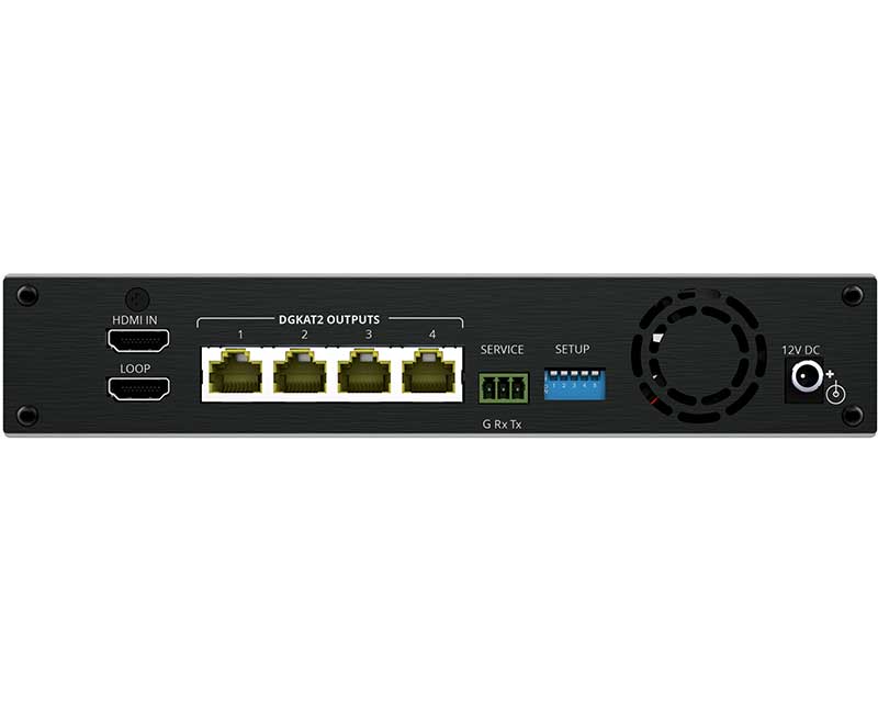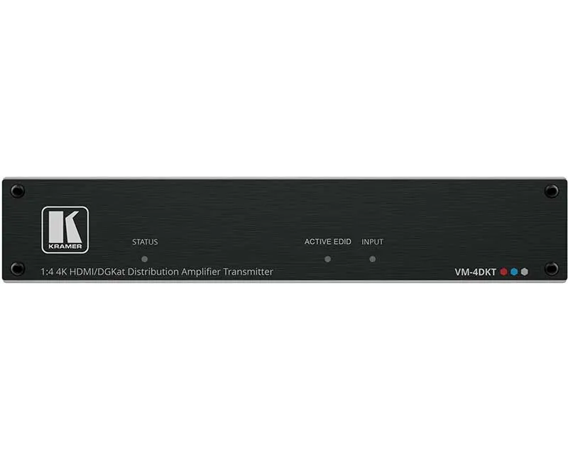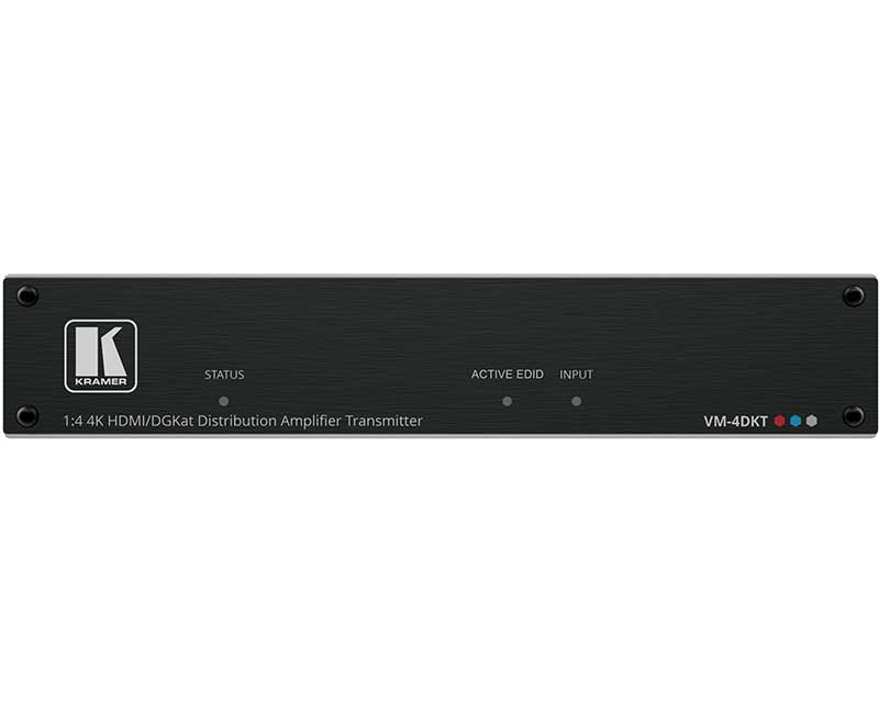 Kramer VM-4DKT — четырехканальный передатчик сигнала HDMI по витой паре. Устройство преобразует входной сигнал HDMI с разрешением до 4K@60 Гц (4:4:4) в сигнал стандарта DGKat™ 2.0, передаваемый по кабелю экранированной медной витой пары, и распределяет его на четыре идентичных выхода, к каждому из которых подключаются совместимые приёмники DGKat, такие как PT-872XR, TP-874XR.