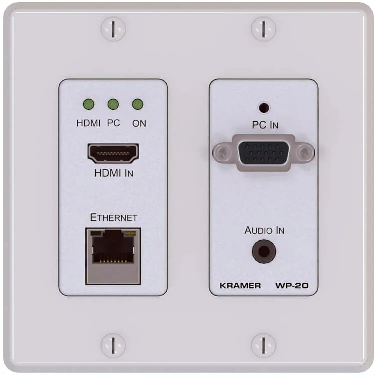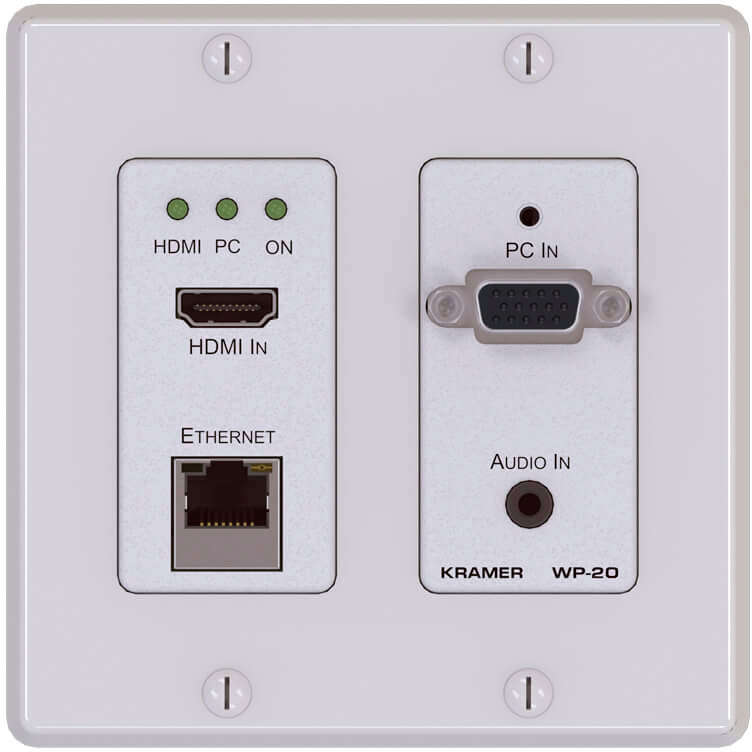 Kramer WP-20 – настенный передатчик сигнала HDMI, VGA и небалансного стереофонического аудиосигнала по кабелю на витой паре по технологии HDBaseT. Прибор поддерживает разрешения до 4К и обеспечивает интеллектуальную обработку EDID. WP-20 выполняет внедрение аудиосигнала в сигнал HDMI, а также выдает извлеченный из HDMI аудиосигнал. Выбор входов осуществляется автоматически или по сигналу управления. Питание прибора осуществляется по технологии POE (Power over Ethernet) или от локального адаптера.